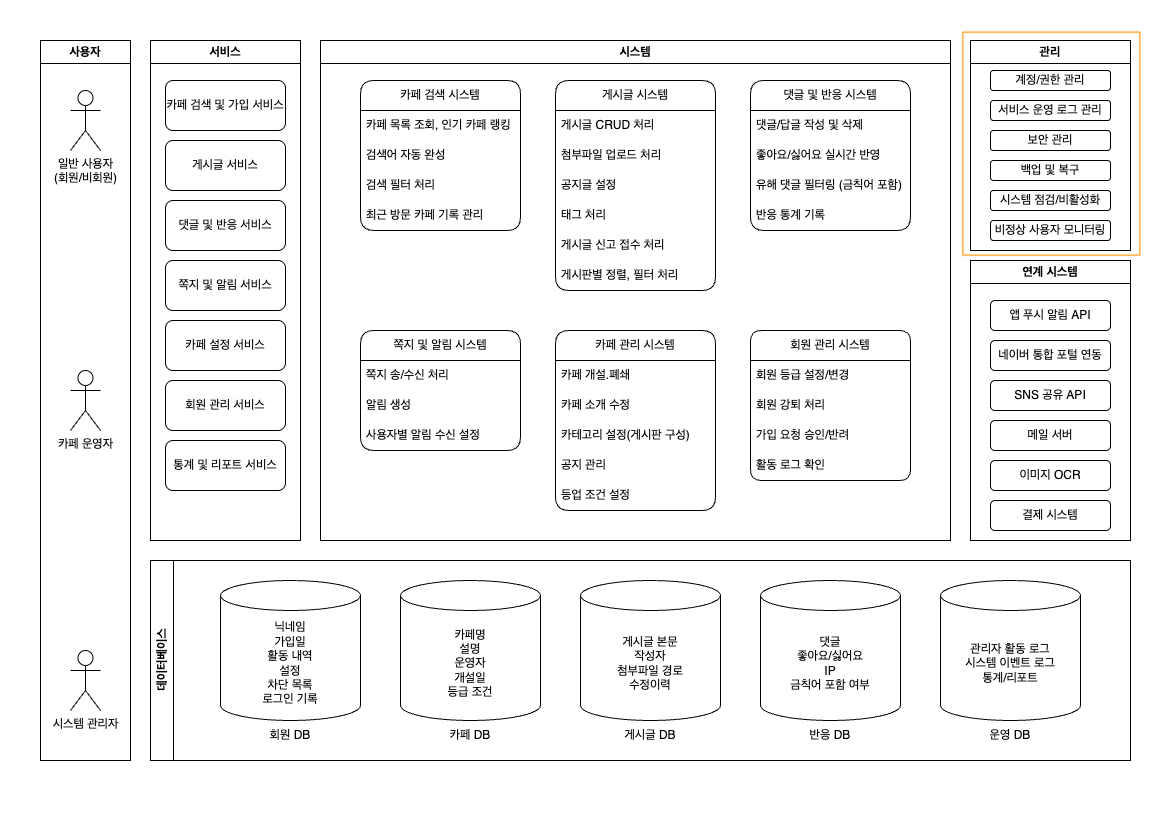 - 카페 DB: 개설 정보, 운영자, 등급 조건